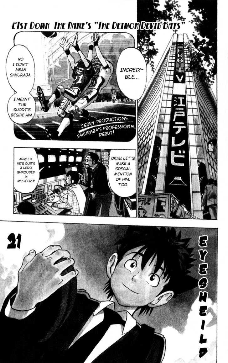 And They're Called the Devil Bats (その名は泥門デビルバッツ "Sono na wa Deimon Debiru Battsu") is the 21st chapter of Riichiro Inagaki and Yusuke Murata's Eyeshield 21 manga series.